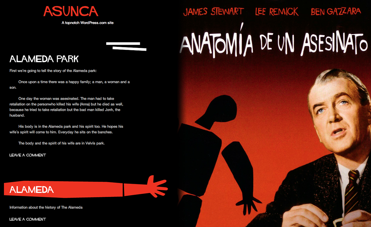 Llama la atención que uno de los títulos del blog esté dentro de un fondo rojo, que finaliza en la imagen de la mano que recuerda al cartel de la película de los cincuenta "Anatomía de un asesinato".