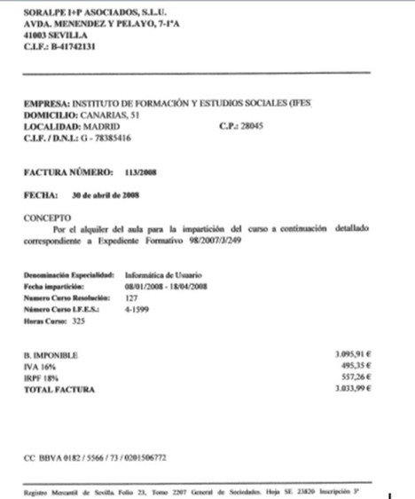 Así, según factura, por las aulas por cada curso cobraba 3.033,9 euros, y en el caso de alquiler de los equipos 6.476, 85 euros, facturas que IFES adjuntaba como justificación de las millonarias subvenciones que la Junta de Andalucía le concedía a UGT Andalucía. Estos cobros iban a parar, finalmente, a UGT confederal, única propietaria de Soralpe I más P Asociados.