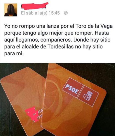 Una afiliada del PSOE ha colgado en su perfil de Facebook un carnet roto de su partido, con el siguiente pie de foto: "Yo no rompo una lanza por el Toro de la Vega porque tengo algo mejor que romper. Hasta aquí llegamos, compañeros".