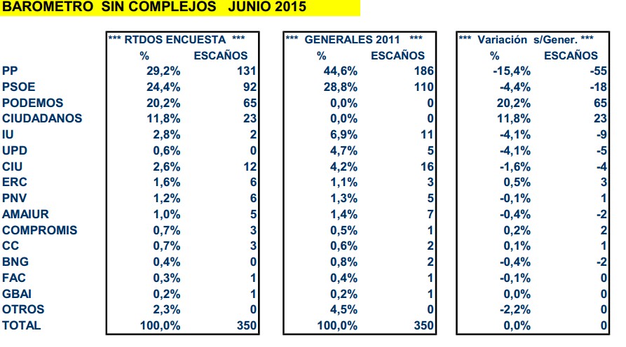 Estas cifras ponen de manifiesto, una vez más, que el PP sufre una importante pérdida de votos, pasa del 44,6% de las generales de 2011 a un 29,2%, perdiendo 55 escaños. No es tan fuerte la caída del PSOE, aunque también pasaría del 28,8%, conseguido en 2011, a un 24,4 por ciento, con 18 escaños menos.