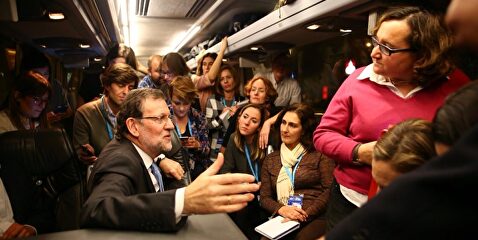 Mariano Rajoy con los periodistas que siguen la campaña electoral del PP | Twitter @marianorajoy