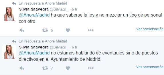 Además, también Twitter, Ahora Madrid dedicó varios comentarios a este asunto, manifestando que han "reducido drásticamente" el número de asesores; "un 56% menos". Afirma también que su grupo es el que "menos asesores eventuales tiene". Villacís respondió: "Porque tenéis 29.000 trabajadores públicos (funcionarios y empleados públicos), valoradlos".
