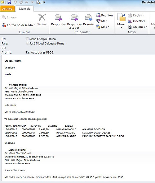 En un correo electrónico que dirige la secretaria ejecutiva de UGT Andalucía María Charpín Osuna a uno de los responsables de compras (antes de Justificaciones) de UGT Andalucía, José Miguel Galdeano Reina, la primera le pide al segundo que le envíe las facturas que se habían remitido al PSOE por los autobuses de 15-S, la manifestación sindical celebrada en 2012 en Madrid). Este es el correo: