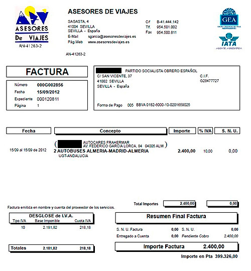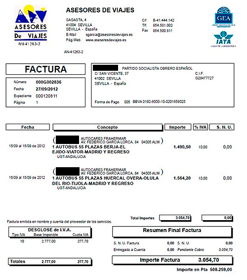 Vemos que no aparece la provincia de Córdoba porque la organización cordobesa de UGT quiso organizar el viaje por su cuenta. El importe total de los viajes ascendió a 136.833,60 euros, que fue dividida en siete facturas, una para cada organización provincial de UGT.