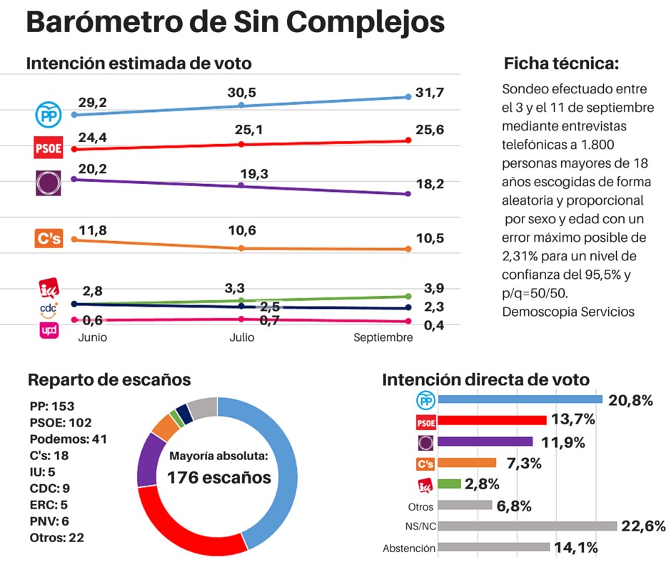 Atendiendo a los datos de este sondeo -efectuado entre los días 3 y 11 de septiembre mediante 1.800 entrevistas telefónicas- el PP ganaría las elecciones con el 31,7% de los votos, lo que supone casi un punto más que el resultado obtenido en el barómetro de julio (30,5%) y 2,5 puntos más que en junio (29,2%). El resultado de septiembre otorgaría a los populares 153 escaños en el parlamento, a 23 escaños de la mayoría absoluta.