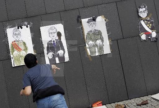 La respuesta del entorno de Bildu-ETA en Navarra a la decisión de Barkos de retirar la escolta a Jaime Ignacio del Burgo fue inmediata: colgaron unos carteles con su caricatura y comenzaron a lanzarle zapatos. En los carteles también había caricaturas de Franco, el Rey y la Guardia Civil.
