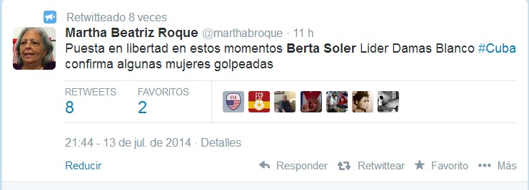 Gracias a las redes sociales y a la presencia de periodistas tanto de la agencia Efe como de France Press, el mundo ha podido conocer otra muestra más de la periódica represión que vive Cuba bajo la mano de Fidel. Es necesario recordar que hace apenas una semana, el domingo día 6 de julio, el régimen castrista detuvo a 125 mujeres del colectivo que encabeza, en distintos puntos del país.