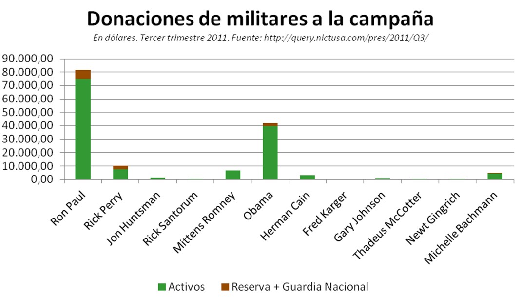 Sus compañeros republicanos suelen criticarle por su rechazo al intervencionismo militar. Paul, veterano de la Fuerza Aérea y de la Guardia Nacional Aérea, replica que el Partido Republicano se caracterizó siempre por su aversión a las guerras y que son los demás candidatos los que han traicionado al partido. En este sentido, llama mucho la atención que el único candidato republicano en posicionarse siempre contra las guerras sea el que más donaciones recibe de los soldados en esta campaña, como sucedió ya en 2008. Durante este tercer trimestre, igual que en el anterior, ha conseguido más donaciones de militares que todos los demás republicanos juntos.