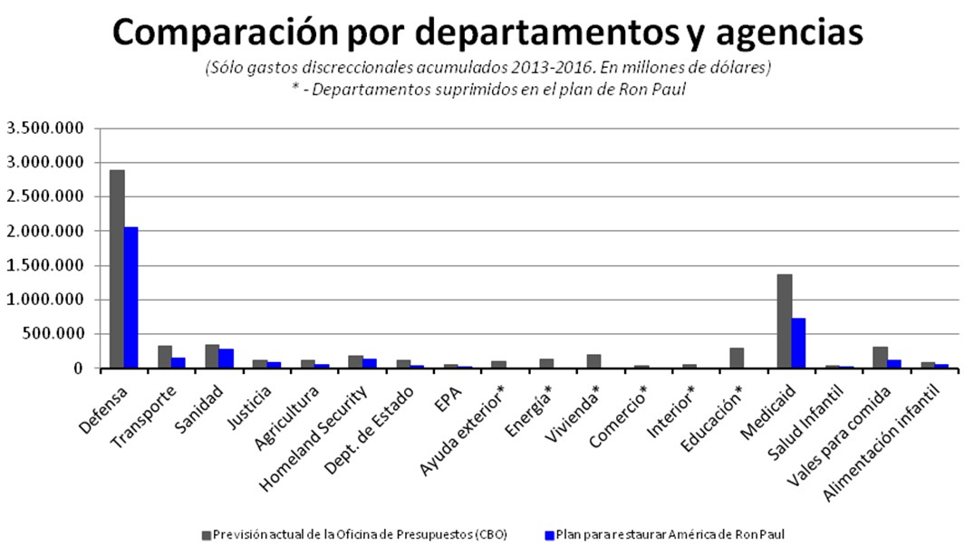 Este mes, el congresista por Tejas y candidato republicano a la presidencia de Estados Unidos Ron Paul presentó en Las Vegas un plan de choque para equilibrar el presupuesto federal en tres años. El ambicioso programa contempla, entre otras medidas, la reducción del gasto público en un billón de dólares durante el primer año, así como el fin de las guerras en Afganistán e Irak, la eliminación de la ayuda externa y de cinco departamentos y varias agencias federales. Ron Paul propone combinar estos recortes de gasto con rebajas en varios impuestos, perseverando en los ideales liberales que lleva más de treinta años defendiendo elocuentemente.