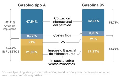 En la actualidad, el litro de gasolina supera los 1,5 euros, mientras que el gasóleo se sitúa por encima de 1,4 euros. Y la subida del IVA que acaba de entrara en vigor podría disparar el precio más allá de los 1,7 euros por litro. El siguiente gráfico muestra cómo se desglosa el precio de los combustibles en España.