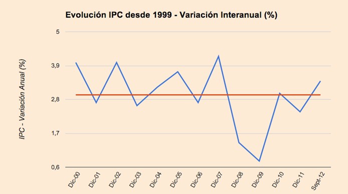 El primer gráfico nos muestra la evolución de la inflación en España desde 1999, medida a través del Índice de Precios de Consumo (IPC). La línea horizontal roja representa la mediana de esa serie histórica: en torno al 3%.
