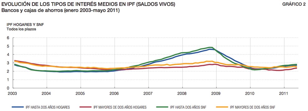 El segundo recoge la evolución del tipo medio de las imposiciones a plazo fijo, tanto para familias como para empresas. La cosa está clara: otro 3% -salvo el repunte por la crisis de liquidez de los bancos, que se han visto obligados a remunerar a un tipo mayor IPFs con menor vencimiento en el período 2007-2010-. Resumiendo, lo comido por lo servido. Así no salimos de la isla...