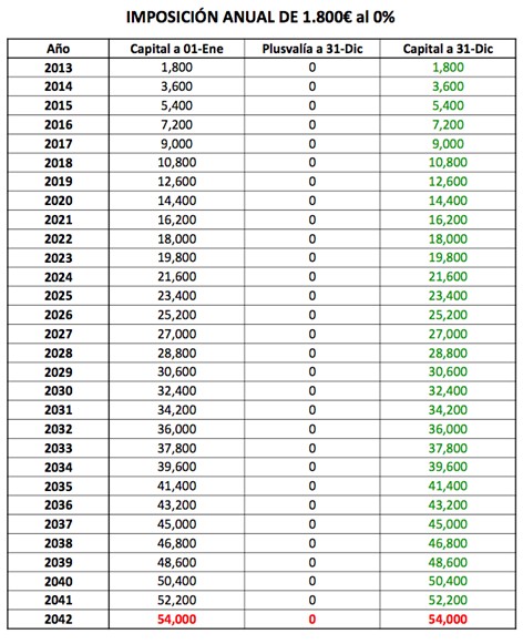 Analicemos ahora, uno por uno, los 4 escenarios descritos. La primera tabla que le muestro corresponde al primer escenario. Esto es, dinero ahorrado, colchón forrado. Un 0% en toda regla a lo largo de cada uno de los 30 años de nuestro horizonte:
