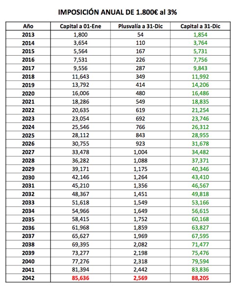 Pasemos ahora al segundo escenario. El archiconocido "plazo fijo" toma cuerpo en forma de un modesto 3%. Y así iría creciendo nuestro capital: