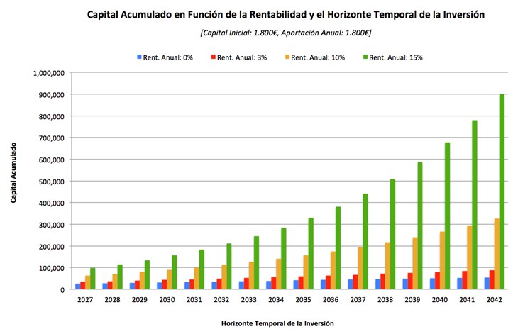 ¡900.000 euros! Repito: 900.000 euros, por invertir 150 euros al mes al 15% durante 30 años.