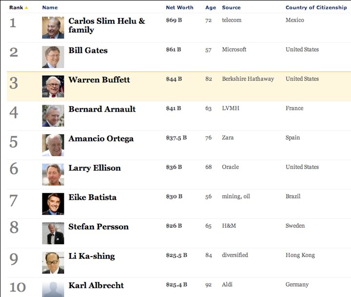 La medalla de bronce, con 44.000 millones de dólares, es para el Gurú de Omaha y dueño de la compañía Berkshire Hathaway, el mítico Value Investor Warren Buffett. Pero hay más. Les mostraba ya en otro artículo esta tabla, pero es que merece la pena volver a echarle otro vistazo. Disfrute, disfrute: