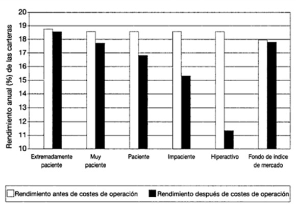 Así, por ejemplo, ser paciente implica realizar pocas operaciones de compra-venta de acciones. Y ya sabe: por cada operación se paga peaje. El corolario es evidente: menos operaciones, menos peajes. En un artículo anterior les hablaba de los tremendos costes asociados a la especulación (La inversión en Bolsa, como el vino, mejora con los años). Les rescato, precisamente, un gráfico de ese artículo: