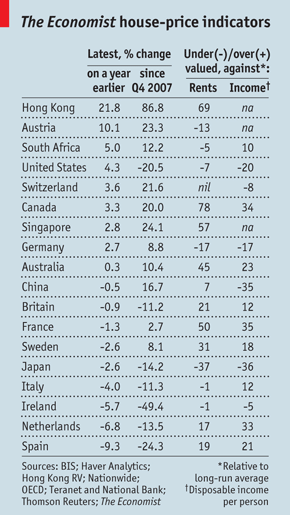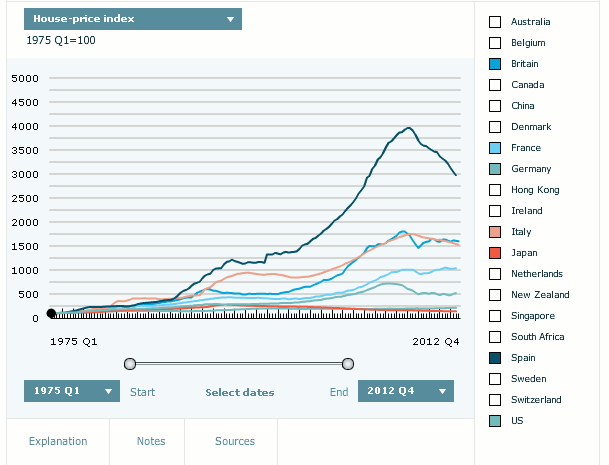 La herramienta del precio de la vivienda de The Economist muestra como España aún se mantiene como el país donde más han subido los precios a largo plazo y pese a la caída. El precio de una vivienda se habría multiplicado por prácticamente 30 veces desde 1975. Al mirar a más corto plazo, desde 1997 o el comienzo de la última burbuja de precios, se observa como España ya no es el país con mayor aumento de precio del mundo.