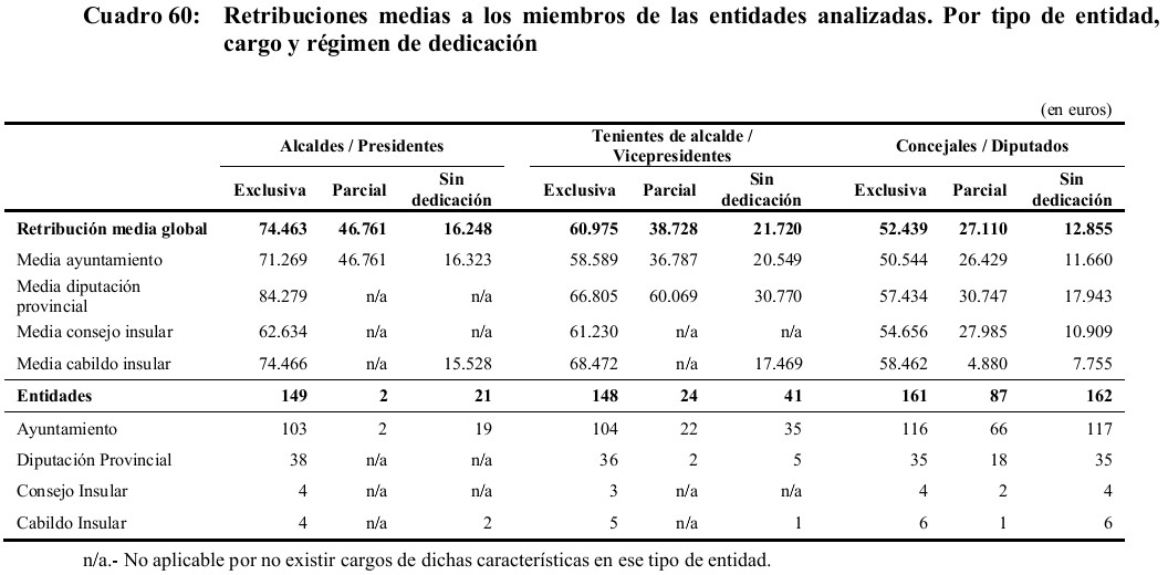 La retribución media de los alcaldes y presidentes de diputación con dedicación exclusiva ascendió a 74.463 euros en 2010; 60.975 euros para los tenientes de alcalde y vicepresidentes; y 52.439 para los concejales y diputados provinciales. El cargo mejor retribuido es el de presidente de diputación, con una media de 84.279 euros.