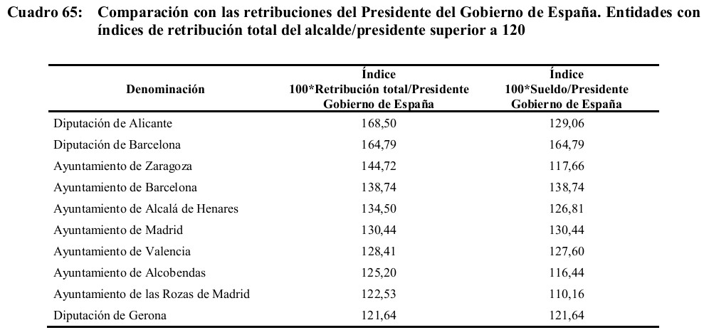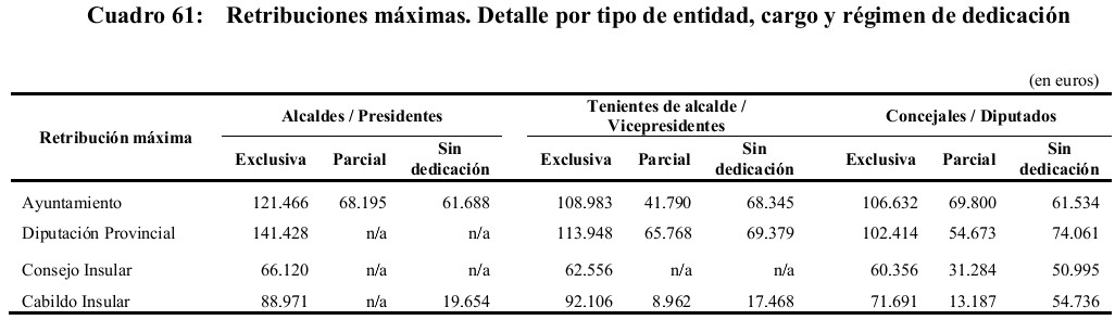 Por otro lado, y puesto que no existen topes legales, algunos cargos cobran sueldos mucho más altos que la media. La retribución máxima en 2010 a nivel de diputación provincial fue de 141.428 euros; a nivel del alcaldía, 121.466 euros; en cuanto a tenientes de alcaldes y vicepresidentes, 113.948 euros; y en cuanto a concejales y diputados, 106.632 euros. Una vez más, destaca el hecho de que los cargos electos sin dedicación hayan cobrado un máximo que oscila entre 61.000 y 69.000 euros al año.