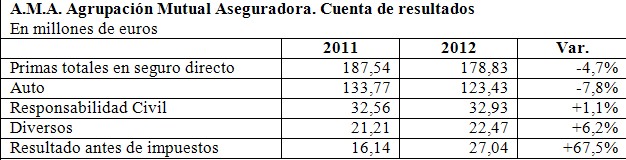 A.M.A. Agrupación Mutual Aseguradora, la única compañía nacional especializada en seguros para profesionales sanitarios, obtuvo en 2012 un beneficio antes de impuestos de 27,04 millones de euros, con un incremento del 67,5% respecto al año anterior, según el avance de resultados presentado por la mutua.