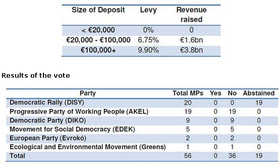 La propuesta que se votó el martes en el Parlamento, y que contaba con el visto bueno del Eurogrupo, consistía en aplicar una quita del 6,75% a los depósitos de entre 20.000 y 100.000 euros y del 9,9% a los de más de 100.000, manteniendo así al margen a los pequeños ahorradores con menos de 20.000 euros en sus cuentas bancarias. De este modo, el Gobierno de Chipre estimaba recaudar unos 5.400 millones de euros, una cuantía que se convertiría automáticamente en acciones para recapitalizar su sistema financiero.