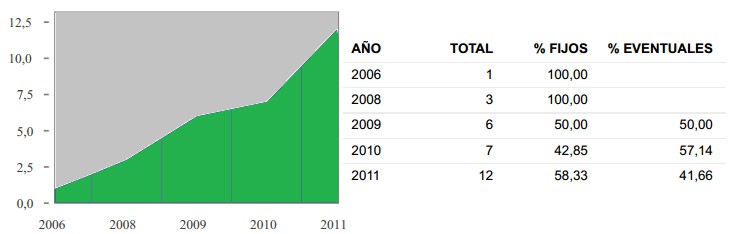 Quizá el aumento en las contrataciones de la compañía tenga algo que ver: según los datos del balance en el año el gasto en personal ascendió a 253.723,61 euros en 2009, cuando la empresa contaba con 6 empleados. En 2010 subió hasta 334.781,46 euros, con 7 empleados. Un año más tarde, en 2011, con 12 empleados el gasto en personal ascendió a 608.259,80 euros.
