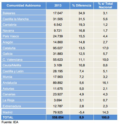 Crecimientos menores se produjeron en Castilla y León (7,45), Murcia (7,2%), Andalucía (5,6%), Asturias (5%), Canarias (5%), La Rioja (3,1%) y Extremadura (2,8%).