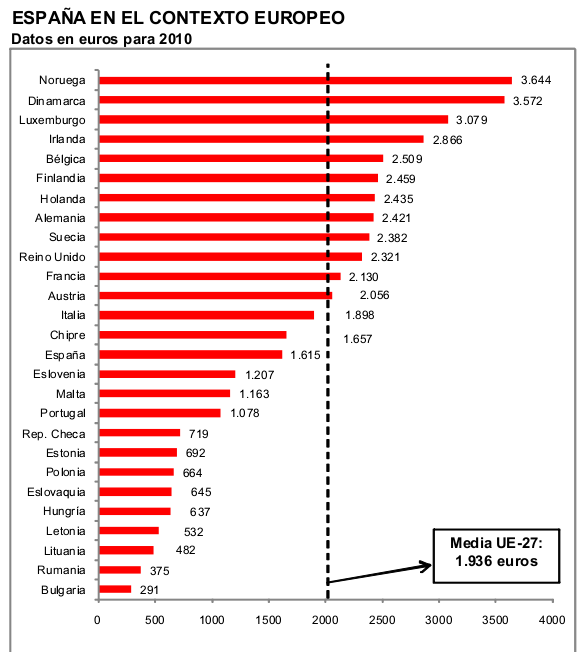 Al mismo tiempo, en catorce países de la UE se registran salarios superiores. La mayor desventaja se encuentra en la comparación con Noruega y Dinamarca, donde el salario medio ronda los 3.600 euros mensuales (más del doble que en España). Además de ellos, el salario medio español resulta al menos un 34% inferior que las remuneraciones de Luxemburgo, Irlanda, Bélgica, Finlandia y Holanda.