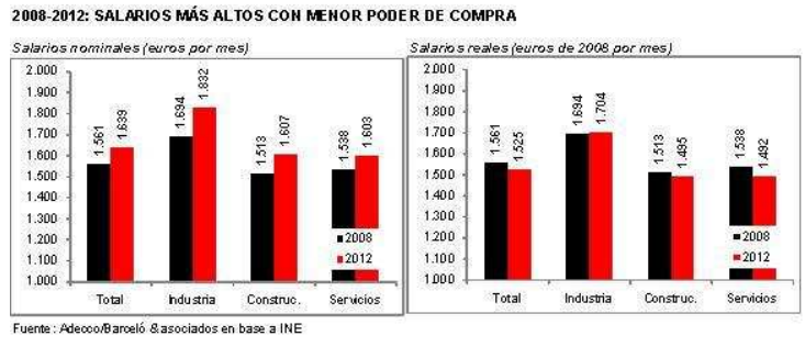 El salario medio del conjunto de la economía española en 2012 fue de 1.639 euros al mes, un 0,5% más que en 2011, según el último Monitor Adecco de Oportunidades y Satisfacción en el Empleo. Sin embargo, el aumento de los precios al consumo superó el avance del salario medio, de modo que la capacidad adquisitiva de los trabajadores cayó un 1,9%. Desde 2008, el salario medio en España sufre una caída en su poder adquisitivo del 2,3%.