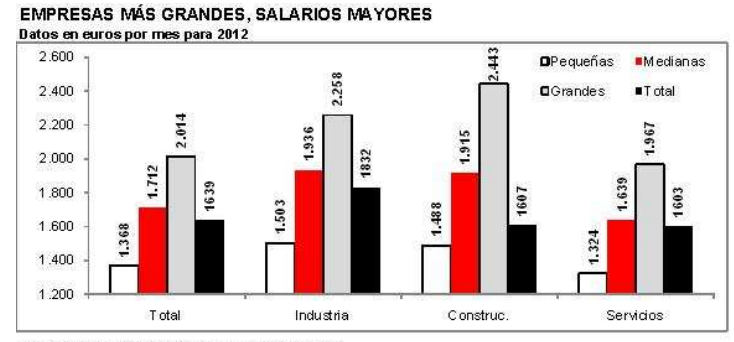Por otro lado, el salario medio es claramente más elevado en las empresas de mayor tamaño (200 ó más empleados), con 2.014 euros, mientras que en las pequeñas (49 empleados o menos) se sitúa en 1.368 euros. Es decir, la remuneración media en las empresas grandes es un 47% mayor que en las pequeñas (646 euros por mes y 7.752 euros al año).