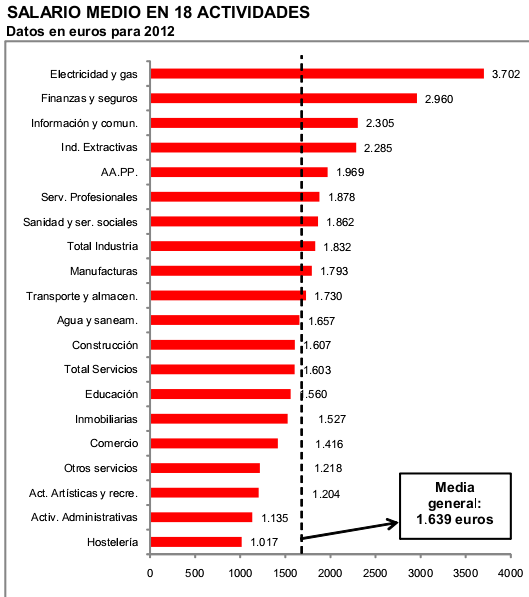 Asimismo, dentro de cada sector, existe una importante diversidad salarial en función de la actividad económica que se trate. En la Industria sobresale la remuneración del área de Electricidad y Gas, que en 2012 fue de 3.702 euros, duplicando la media del sector. De hecho, es el salario más elevado de entre las 18 secciones y el único que supera la cifra de 3.000 euros.