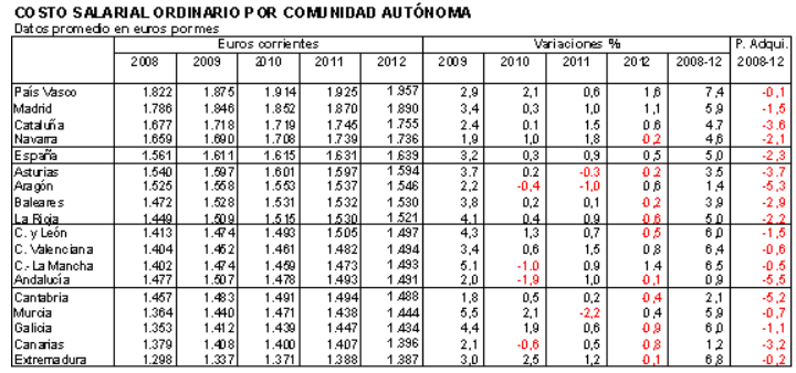 Sólo cuatro comunidades autónomas presentan un salario medio superior al nacional (1.639 euros/mes): País Vasco (1.957 euros), Madrid (1.890 euros), Cataluña (1.755 euros) y Navarra (1.736). En el otro extremo, Canarias y Extremadura son las únicas autonomías con salarios inferiores a 1.400 euros.