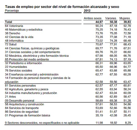 El estudio revela que para las personas que no cuentan con estudios superiores es bastante más difícil encontrar empleo. El INE incluye en la categoría de Programas de formación básica a todos aquellos que cuentan sólo con la ESO o el bachillerato. La tasa de empleo de este grupo alcanza poco más del 35% en la tasa de empleo.