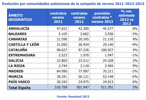 Randstad prevé que durante la campaña de verano se realicen en España 511.000 nuevos contratos en el sector de trabajo temporal. Esta cifra supone un incremento del 2% respecto a la misma época del año pasado, un dato positivo dentro de la grave situación que sufre el mercado laboral español con más de 6 millones de parados.