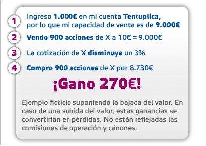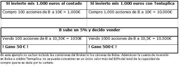 Es decir, estas cuentas incrementan tu poder de inversión dado que podrás hacer una inversión mayor que la que realizarías si solo utilizas el capital desembolsado por ti. En el caso de la cuenta Tentuplica multiplicas x 10 tu poder de inversión, tal y como se ve en este ejemplo: