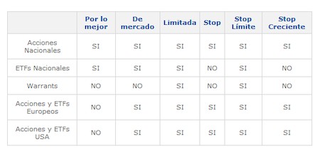 Queremos dejar claro también que no todos los brokers ofrecen todas las órdenes que comentamos ni en todas las cuentas. Sin embargo, en Self Bank sí que tienes todos estos tipos para sacar mayor partido a tus inversiones. En la tabla que verás a continuación están organizadas también por producto y mercado: