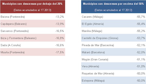 Por localidades, Casares (Málaga), El Egido (Almería) y Manila (Málaga) acumulan caídas desde el primer trimestre de 2007 de más de un 55%. En el lado contrario, las viviendas en Baiona (Pontevedra) y Capdepera (Baleares) se han abaratado menos de un 15%.