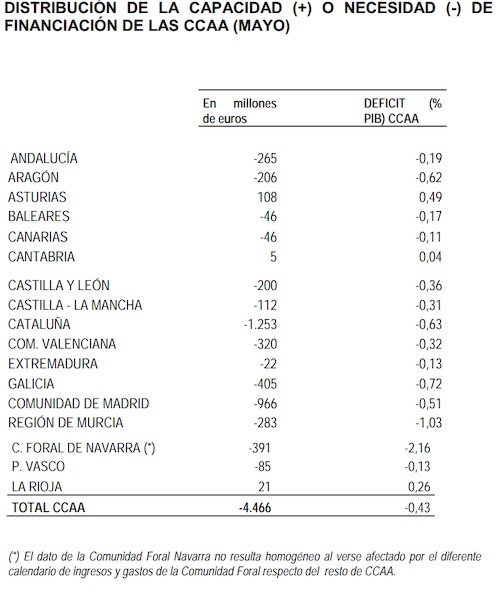 En el desglose por comunidades autónomas, catorce de ellas registraron déficit en los cinco primeros meses del año. Hasta abril, doce comunidades habían registrado déficit, pero en el mes de mayo se han unido al grupo Extremadura y País Vasco. La comunidad con el déficit más elevado en función de su PIB ha sido Navarra, con un déficit del 2,16%. A continuación, se han situado Murcia (-1,03%), Galicia (-0,72%) y Cataluña (-0,63% de su PIB).
