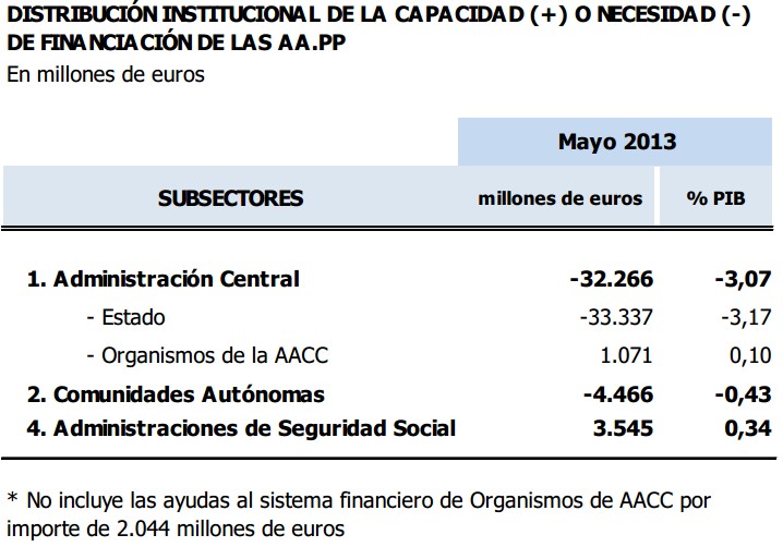 El saldo negativo del conjunto de la Administración Central resulta de unos ingresos no financieros de 39.570 millones y unos gastos de 73.880 millones. Además, incluyen 2.044 millones de ayudas al sistema financiero. Sin ellas, el déficit de la Administración Central sería de 32.266 millones (el 3,07% del PIB). Al desglosar el dato de la Administración Central, se observa que el Estado se anotó un saldo negativo de 33.337 millones de euros, el 3,17% del PIB, y que los Organismos de la Administración Central sumaron un déficit de 973 millones, el 0,10% del PIB. Sin tener en cuenta las ayudas financieras, estos organismos presentarían un superávit de 1.071 millones. El Gobierno ha querido destacar que ese 3,17% del PIB supone una caída del 6,5% respecto a la cifra de mayo de 2012, incluso aunque ha habido "un incremento significativo en partidas como los gastos en intereses y por desempleo".