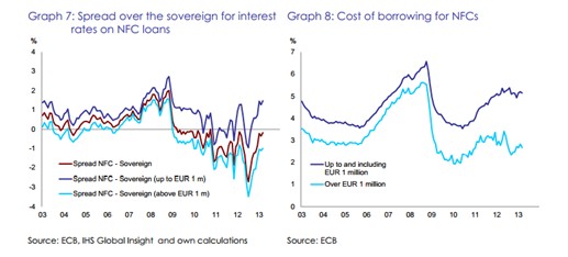 Con todo, el coste de la financiación para las empresas más grandes se ha reducido hasta niveles equiparables al 2003-2005. Para aquellas pocas pymes que sí reciben financiación, su coste no es tan elevado como en otras crisis pero ha crecido en 2012 y sigue haciéndolo en 2013 (es 100 puntos básicos superior al promedio de 2003-2005), reflejo de su deterioro. En todo caso, de acuerdo con el BCE el coste de la financiación de las empresas españolas es superior al promedio de las empresas europeas.