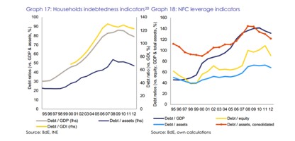 A pesar del desempleo, la caída de beneficios, la moderación salarial, las continuas subidas de impuestos y la caída de la actividad económica, el sector privado ha reducido en 20 puntos porcentuales del PIB su deuda desde el pico, pero aun así todavía mantiene niveles muy superiores a la época previa al boom. De acuerdo con la experiencia y los datos históricos, se espera un proceso de desendeudamiento prolongado, sobre todo si no se implementan medidas que ayuden a las empresas y familias a sanearse.