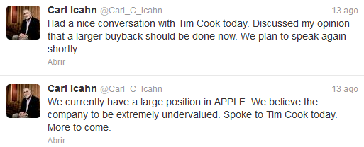 Carl Ichan, un conocido inversor de Wall Street, anunció el pasado martes a través de su cuenta en Twitter que había comprado un importante paquete de acciones de la compañía tecnológica Apple -se estima que unos 1.000 millones de dólares-, advirtiendo, además, de que la empresa estaba "extremadamente infravolorada". Poco después, en un segundo tweet, afirmaba a sus seguidores (más de 59.000) que había mantenido una conversación con Tim Cook, el consejero delegado de Apple, para recomendarle que incrementara su prorama de recompra de acciones.