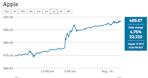 Los dos mensajes de Ichan corrieron como la pólvora a través de esta red social, impulsando las acciones de Apple un 5% en apenas unos minutos, lo cual se traduce en una subida próxima a los 17.000 millones de dólares. Hasta entonces, Apple subían en torno al 1,6%, pero los mensajes del inversor hicieron que cerrara la sesión rozando los 490 dólares por título.