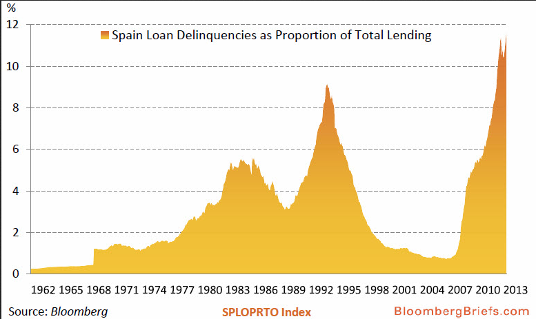 Si se echa la vista atrás, se observa que se trata de la mayor tasa de morosidad de la historia de la banca española, ya que marca un nuevo récord desde que el Banco de España recopila datos, hace casi 50 años. La tasa actual supera en 2,45 puntos porcentuales el máximo alcanzado en la crisis anterior, que data de 1994, cuando se estableció en el 9,15%. También supone 2 puntos porcentuales más que la tasa registrada en junio de 2012 (9,6%).