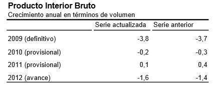 El Instituto Nacional de Estadística (INE) ha actualizado la serie contable del PIB de los años 2009-2012 y ha elevado en dos décimas la contracción de la economía el año pasado, hasta el -1,6%, al tiempo que ha rebajado tres décimas el crecimiento estimado en 2011, hasta el 0,1%. En cuanto al año 2010, el INE ha reducido una décima la contracción del PIB estimada inicialmente, hasta el -0,2%. En cambio ha elevado una décima la caída de la economía del año 2009, hasta el -3,8%
