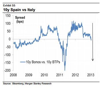 A las "divergencias económicas" de España con Italia habría que sumarle "las políticas", afirma Morgan Stanley. Los analistas aseguran que las consecuencias del impacto de la "endémica" incertidumbre política del país transalpino aumentan aun más la brecha entre los dos países.