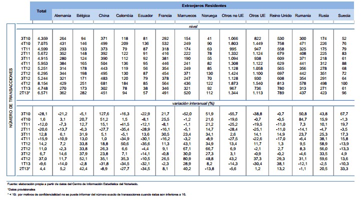 Durante el segundo trimestre de 2013 el número de compraventas realizadas por extranjeros se situó en 14.593. De esta forma, las operaciones realizadas por el total de extranjeros se han acelerado de forma notable con respecto a trimestres anteriores, con un incremento interanual del 23%. En la distribución de las operaciones realizadas por extranjeros pesaron más las realizadas por no residentes, con un 54,9%.