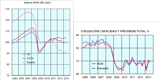 Respecto al inicio de la crisis, la industria española todavía no se habría recuperado. Prácticamente en todos los sectores se ha reducido la producción industrial, excepto en la industria farmacéutica. En términos de valor añadido, la industria se encuentra en un 94,1% de 2008, aunque en el segundo trimestre ha crecido, alcanzando el 95%. A ello, se suma una pobre utilización de su capacidad productiva, de poco más del 70%.