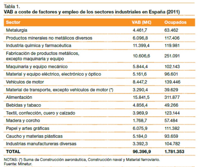 De acuerdo con los últimos datos del Ministerio de Industria (Minetur), la industria aportó en 2012 el 13,32% al PIB (en forma de valor añadido -VA-), frente al 14,8% en los países de la UE15. Dentro de la industria, la manufacturera es el sector que más peso tiene, un 74,8%, frente a la energética (20,7%) y la extractiva no energética.